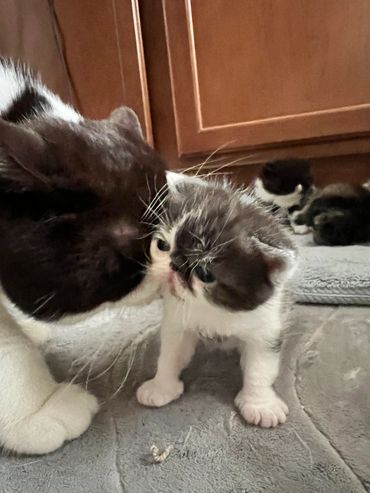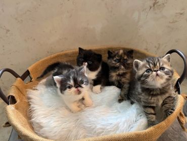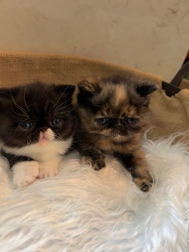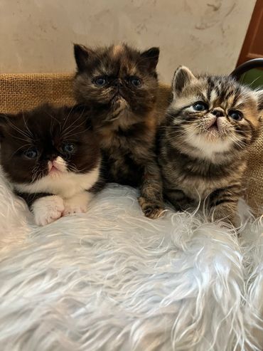 Our Bloodline begins with two CFA registered handpicked exotic shorthairs, one from Russia and one from Germany. Combined they have beautiful healthy kittens without any of the worries that come when inbreeding occurs. Our Kittens will be examined by a Lisenced Veterinarian and will have a certificate of health prior to going to their forever home.